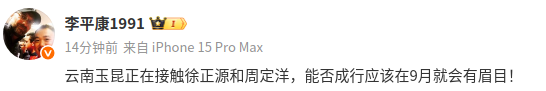 社媒原文:“云南玉昆正在接触徐正源和周定洋,能否成行应该在9月就会有眉目!”